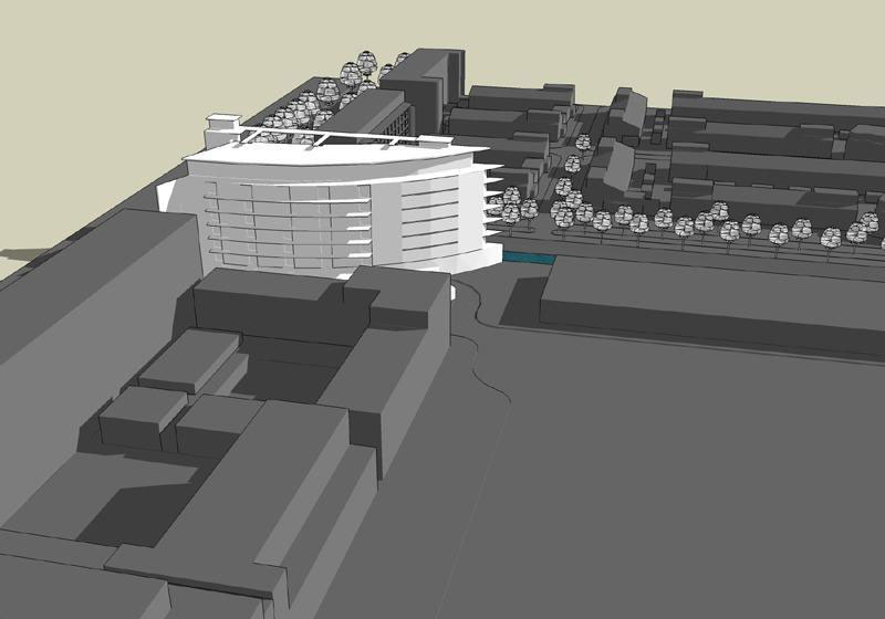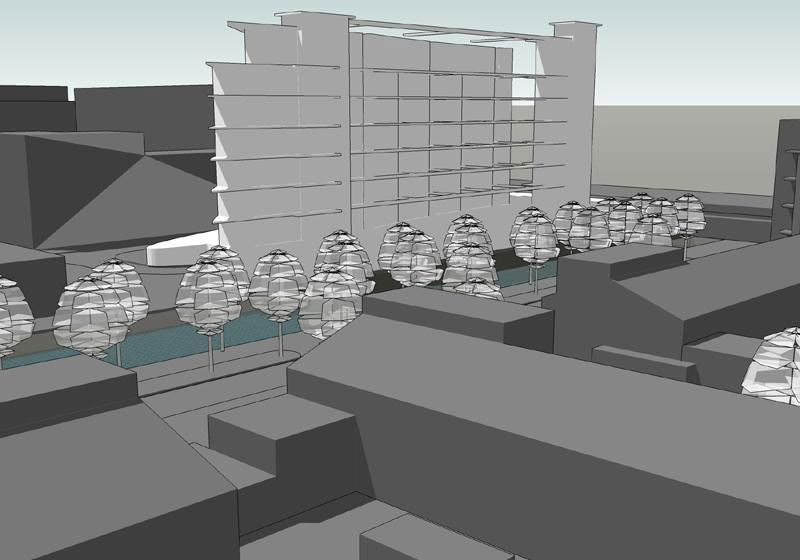 Het clustergebouw huisvest naast een nieuw stadskantoor ook een medisch centrum en een activiteitencentrum voor verstandelijk gehandicapten. In het stedebouwkundig plan formeren de nieuwe gevel van het clustergebouw, de bestaande gevel van het sportcentrum en een dun te ontwikkelen woongebouw op kolommen een nieuw laaggelegen stadsplein dat in zuidelijke richting overgaat in een bestaand stadspark. Het stadsplein ligt ca. 5 meter lager als de Bijlmerdreef die op niveau door dit deel van de Bijlmer loopt. Een brede trap langs het clustergebouw verbindt het niveau van de Bijlmerdreef met het nieuwe stadsplein.
